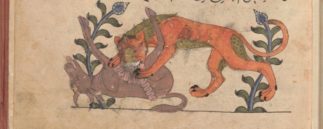 عيون لا تكاد تفوت شيئا مما ترى من حيوات الوحوش مادة للشعر وكذلك للعزاء فلسفة تعين على الحياة كمثل ما فعل أبو ذؤيب في قصيدته النبيلة في رثاء أولاده وكيف انتزع العزاء لنفسه من مشاهد الحياة من حوله والبلاءات التي يخوضها الوحش في مشاهد متلاحقة أسيانة يصدر كل منها بالشطرة المروعة