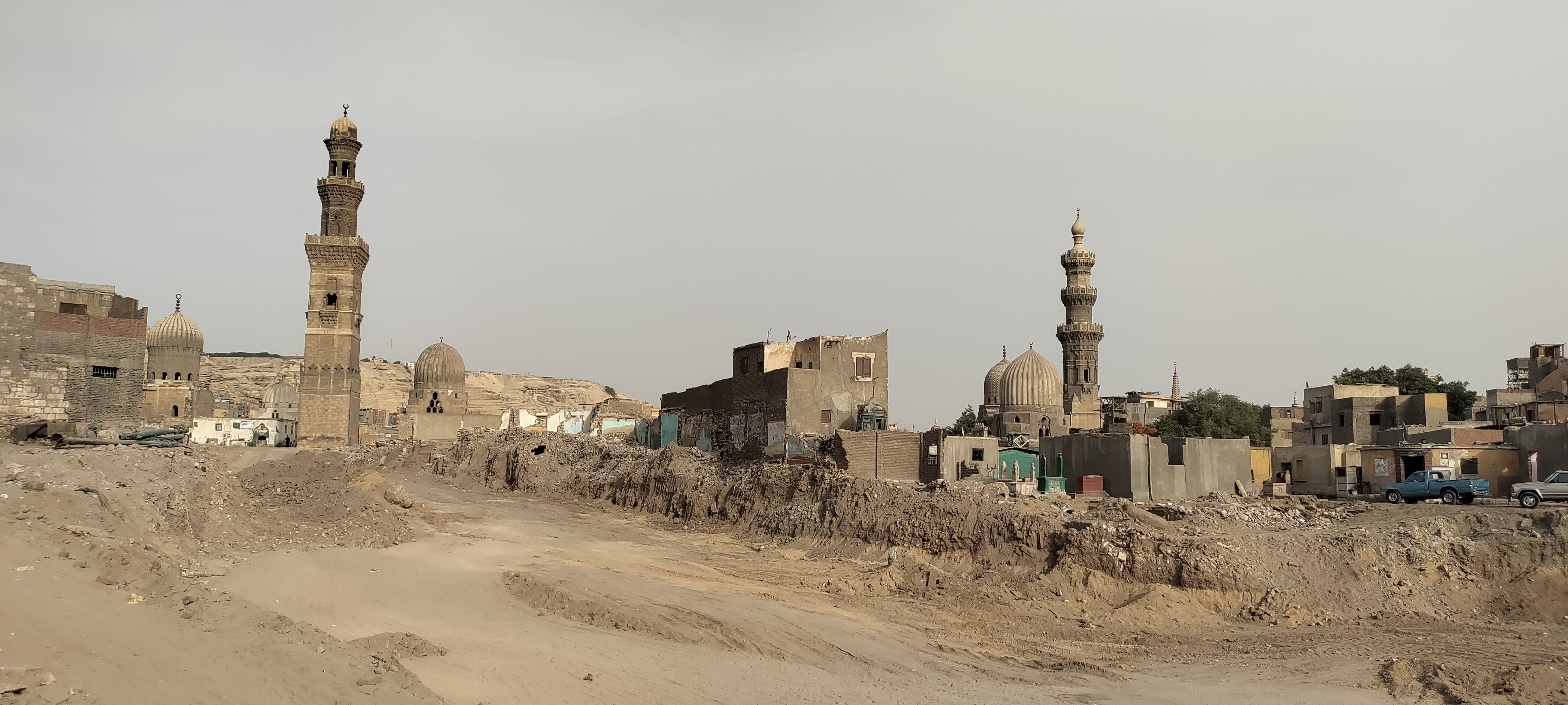 (في الصورة مدافن تربة الجلال السيوطي المجرفة والأرض المحروثة والصهريج/البئر في ذلك الموضع قرب مأذنة قوصون على اليسار)