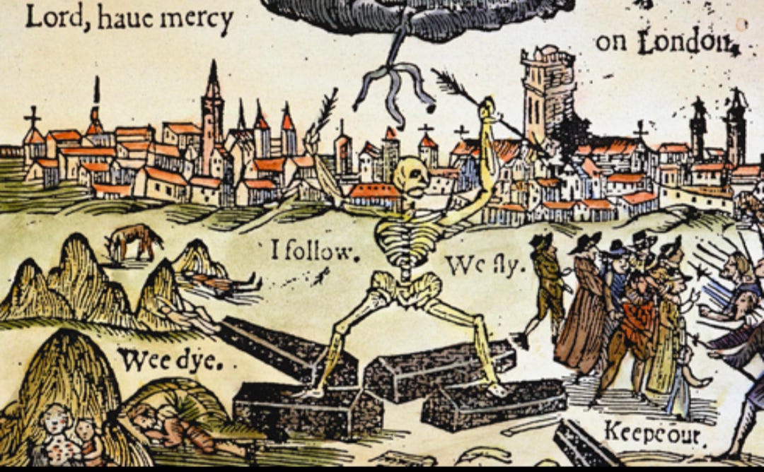 (اللوحة من زمن الطاعون العظيم في القرن السابع عشر وتمثل ببراعة مشاركة المدينة أهلها فيما يصيبهم من النوازل ولذا يرمز التوسل بالصورة يا مولانا ارحم لندن وحاصد الأرواح قد أحال المدينة خرابا وها هو يوزع سهامه يمينا ويسارا ويطأ بقدميه على التوابيت المتناثرة والناس بين ميت وفار)